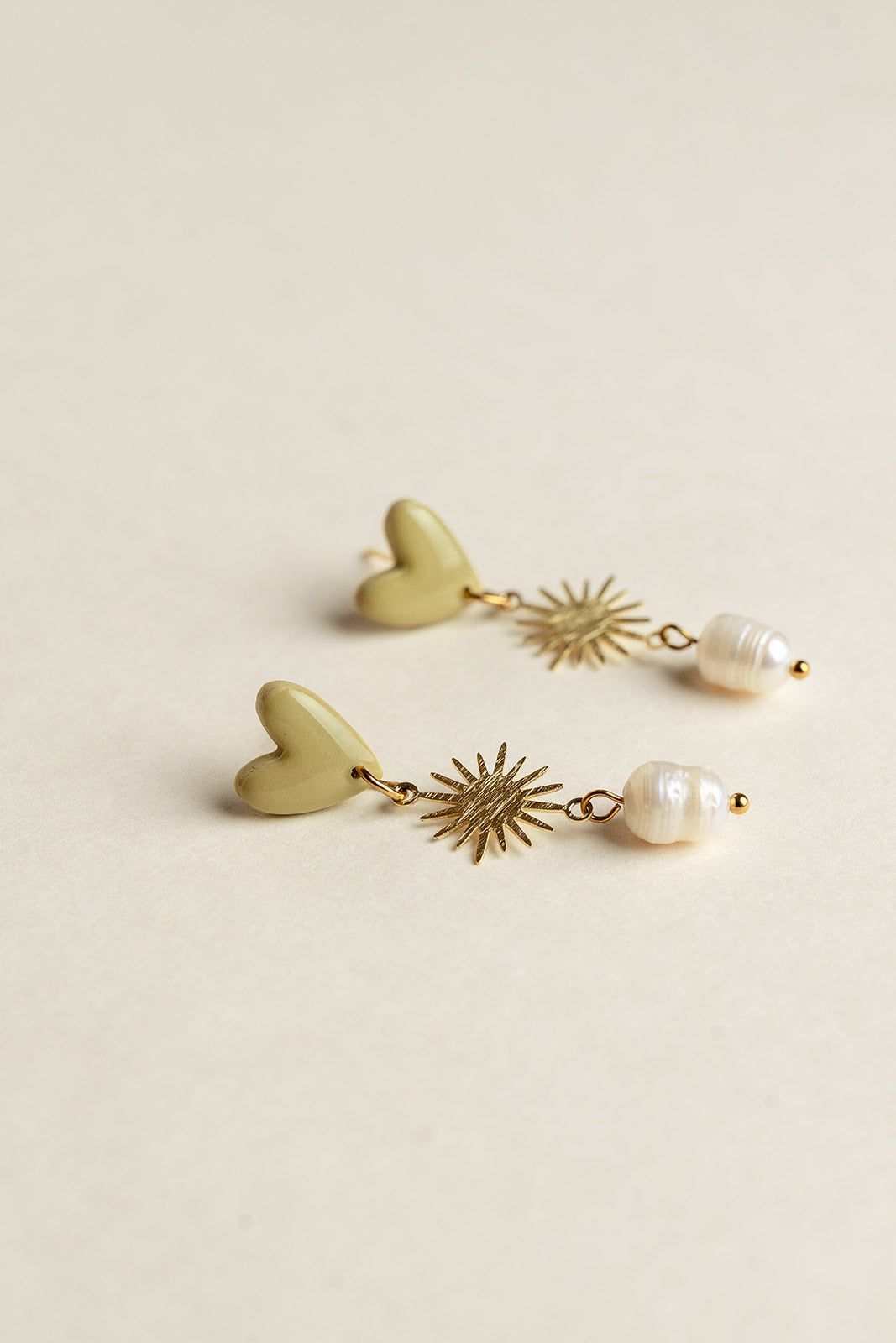 - The earrings are made of polymer clay, epoxy resin, stainless steel hardware, a brass sun charm and a freshwater pearl