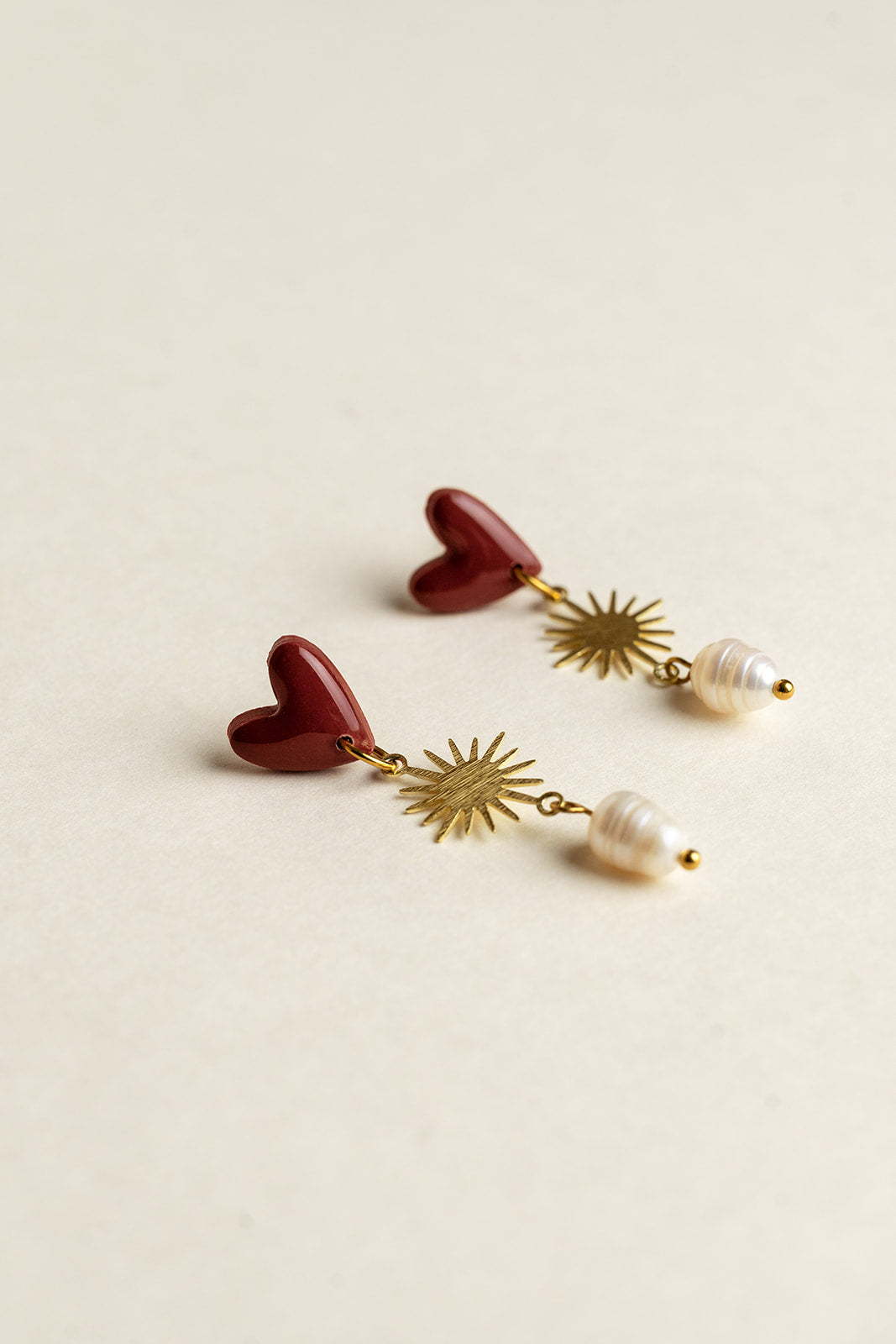 - The earrings are made of polymer clay, epoxy resin, stainless steel hardware, a brass sun charm and a freshwater pearl
